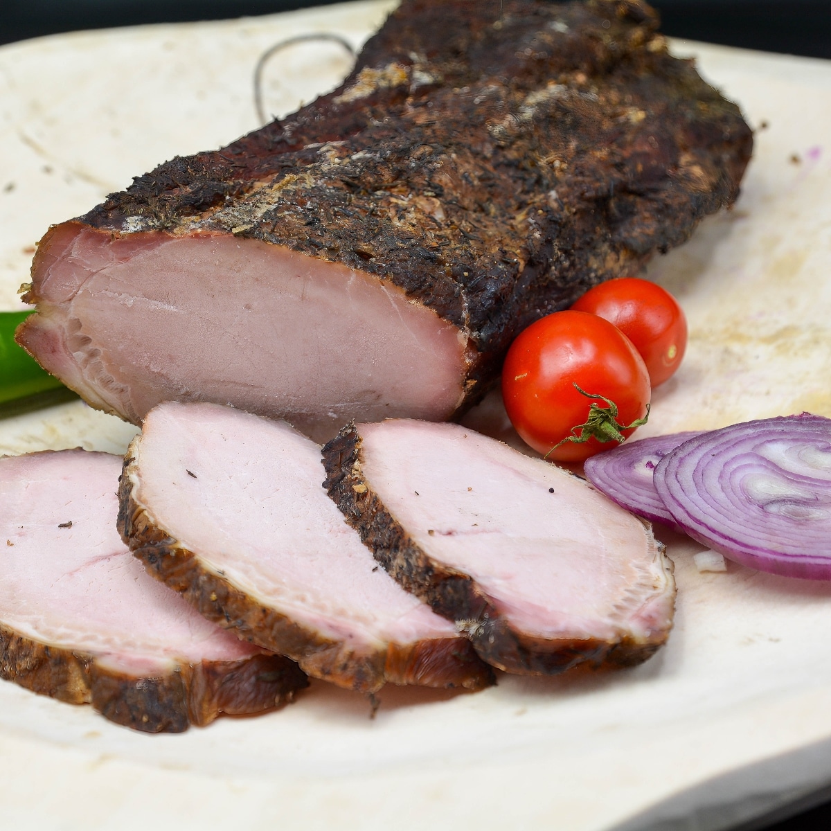 Produs din carne de porc afumat la lemn de fag, dichisit cu sare, piper, usturoi și condimente naturale (cimbru), fără coloranți sau arome sintetice!